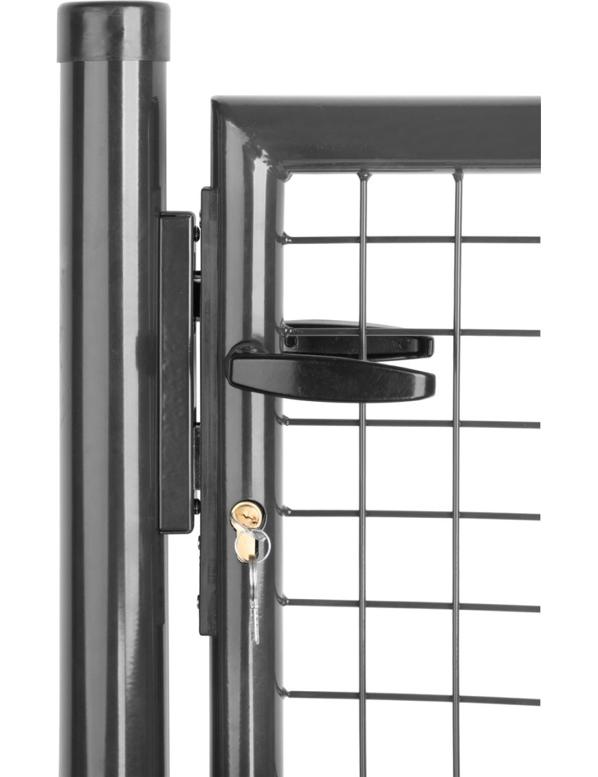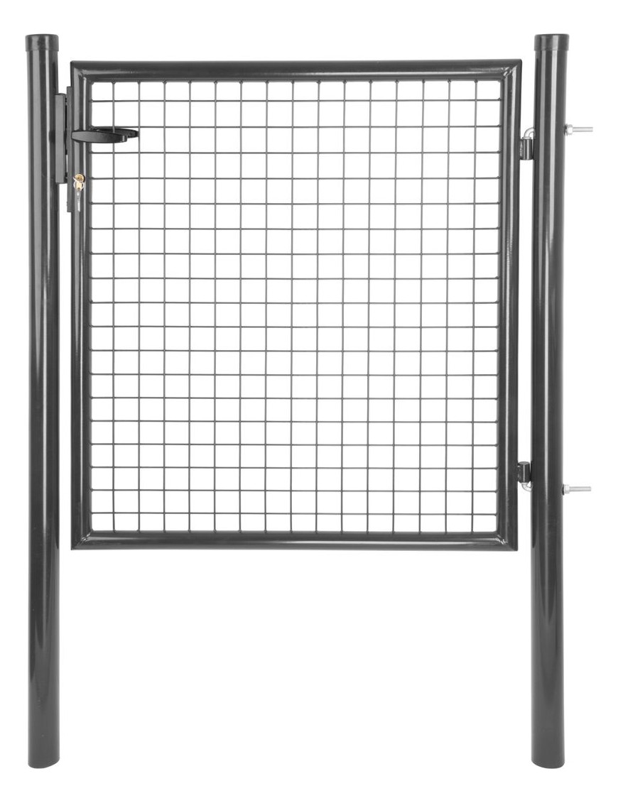Záhradná jednokrídlová brána s výplňou zváranej siete s okami vo veľkosti 50 x 50 mm a hrúbkou drôtu 4 mm. Úprava je zinok + PVC. Farba antracit. Výška produktu = výška bránky od terénu po vrch krídla.