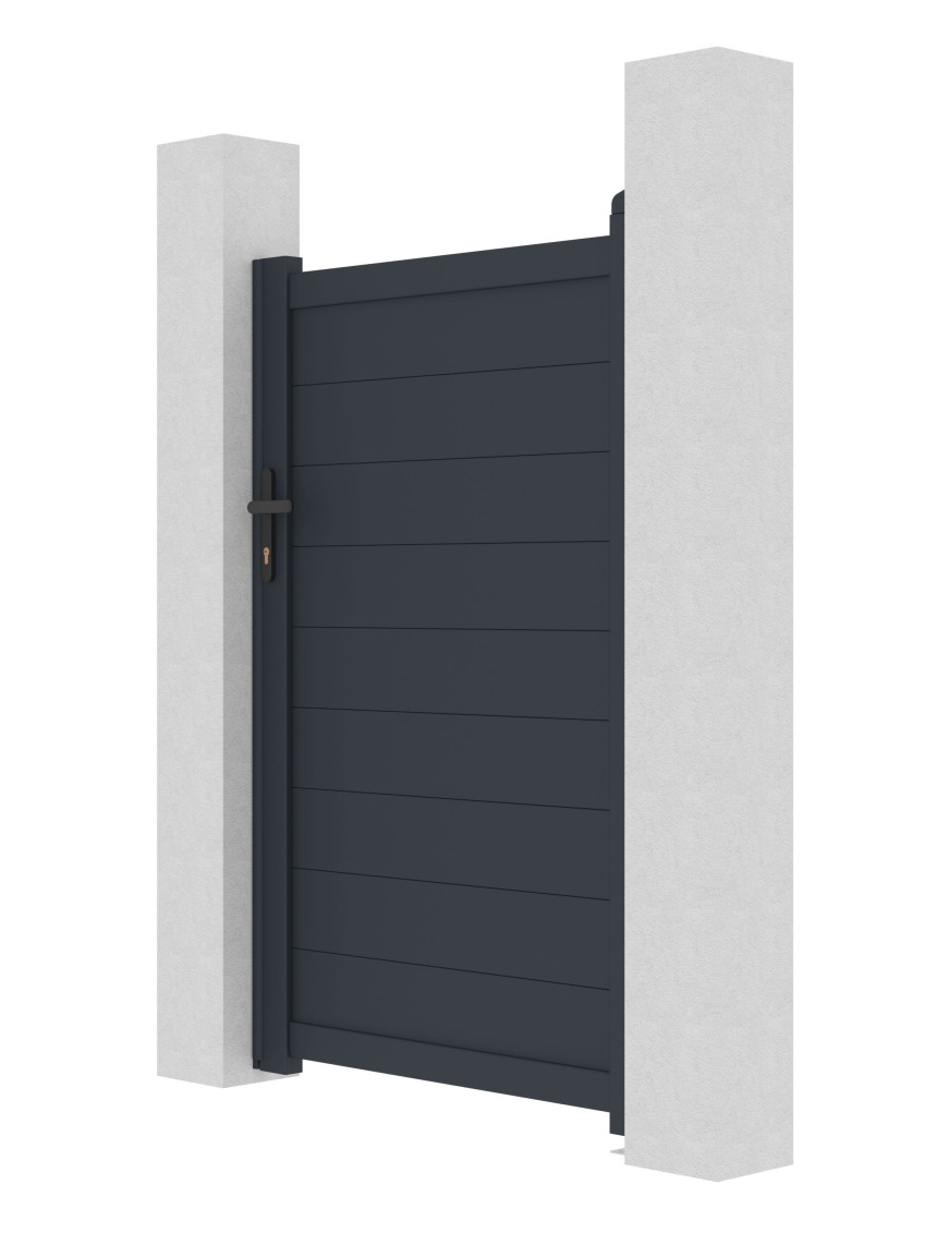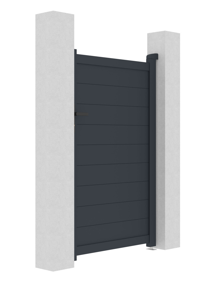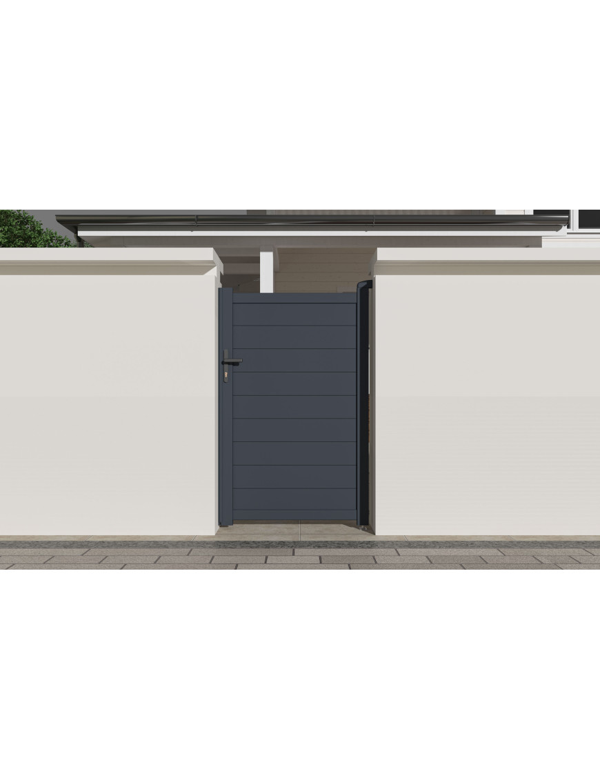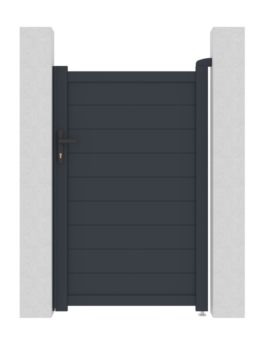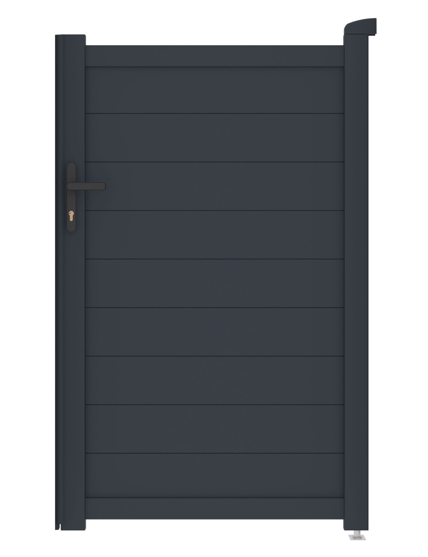 Výplň s horizontálne uloženými lamelami v atraktívnom grafitovom prevedení kombinuje dostatok súkromia s moderným dizajnom, takže bránka s otváraním dovnútra pristane každému typu oplotenej stavby.