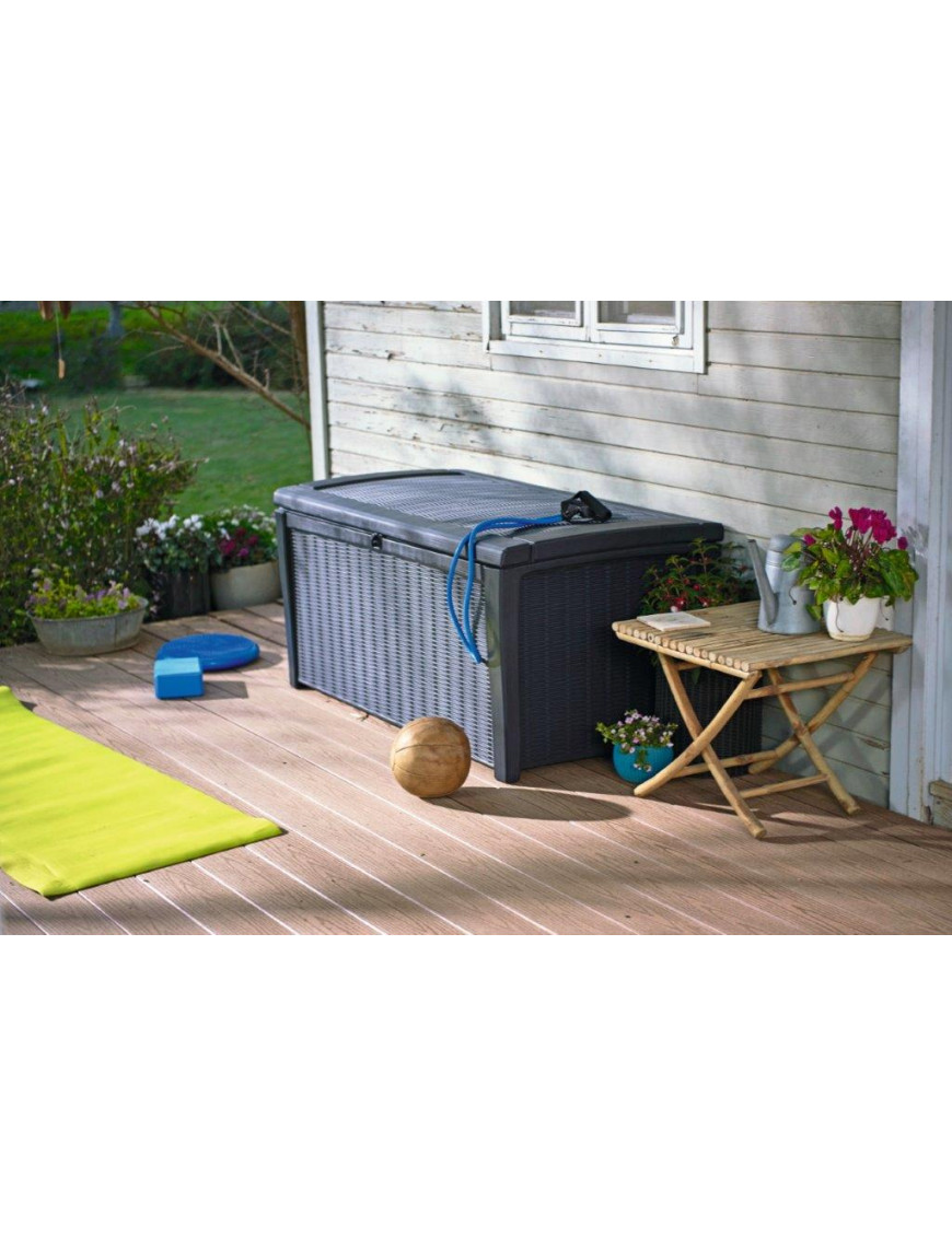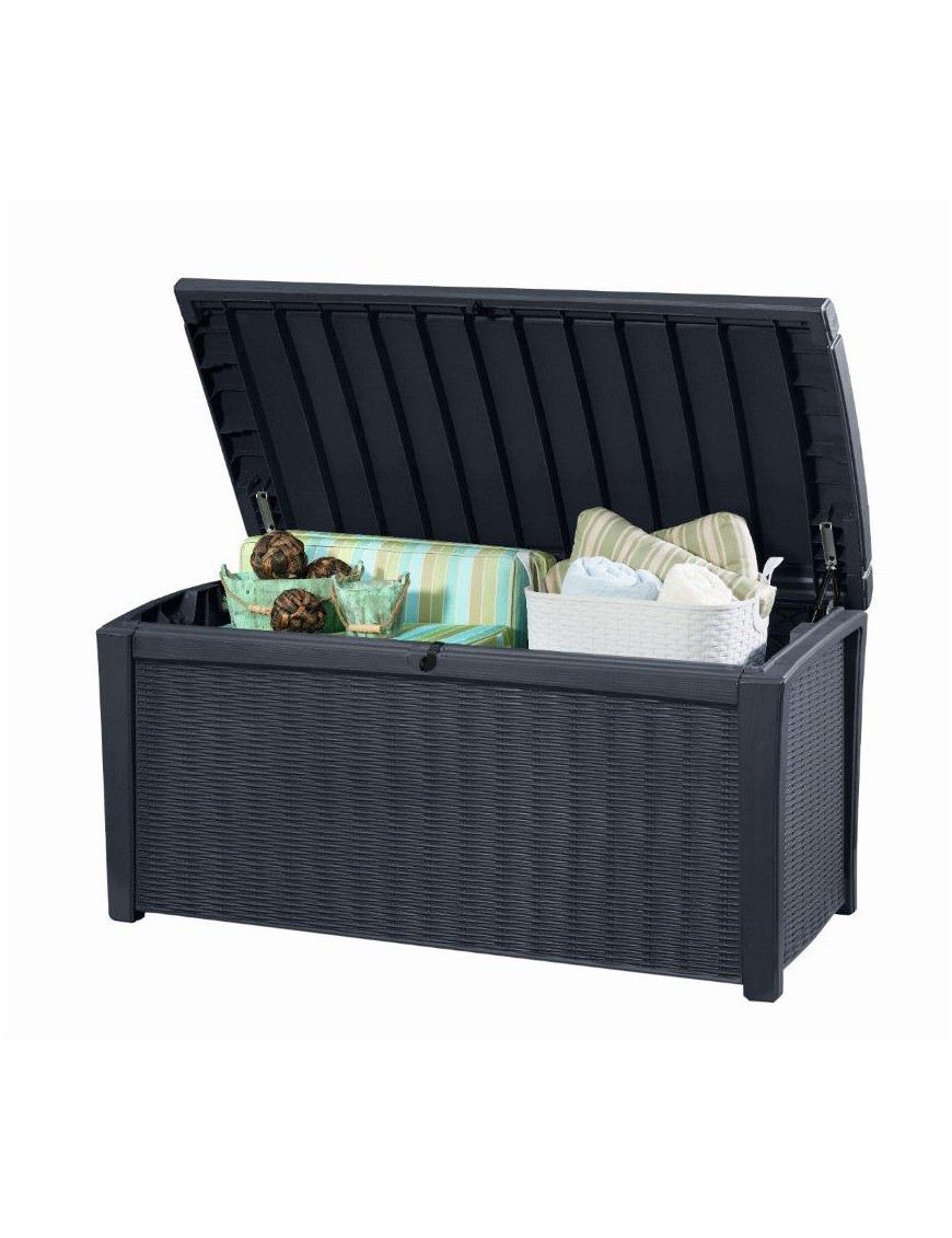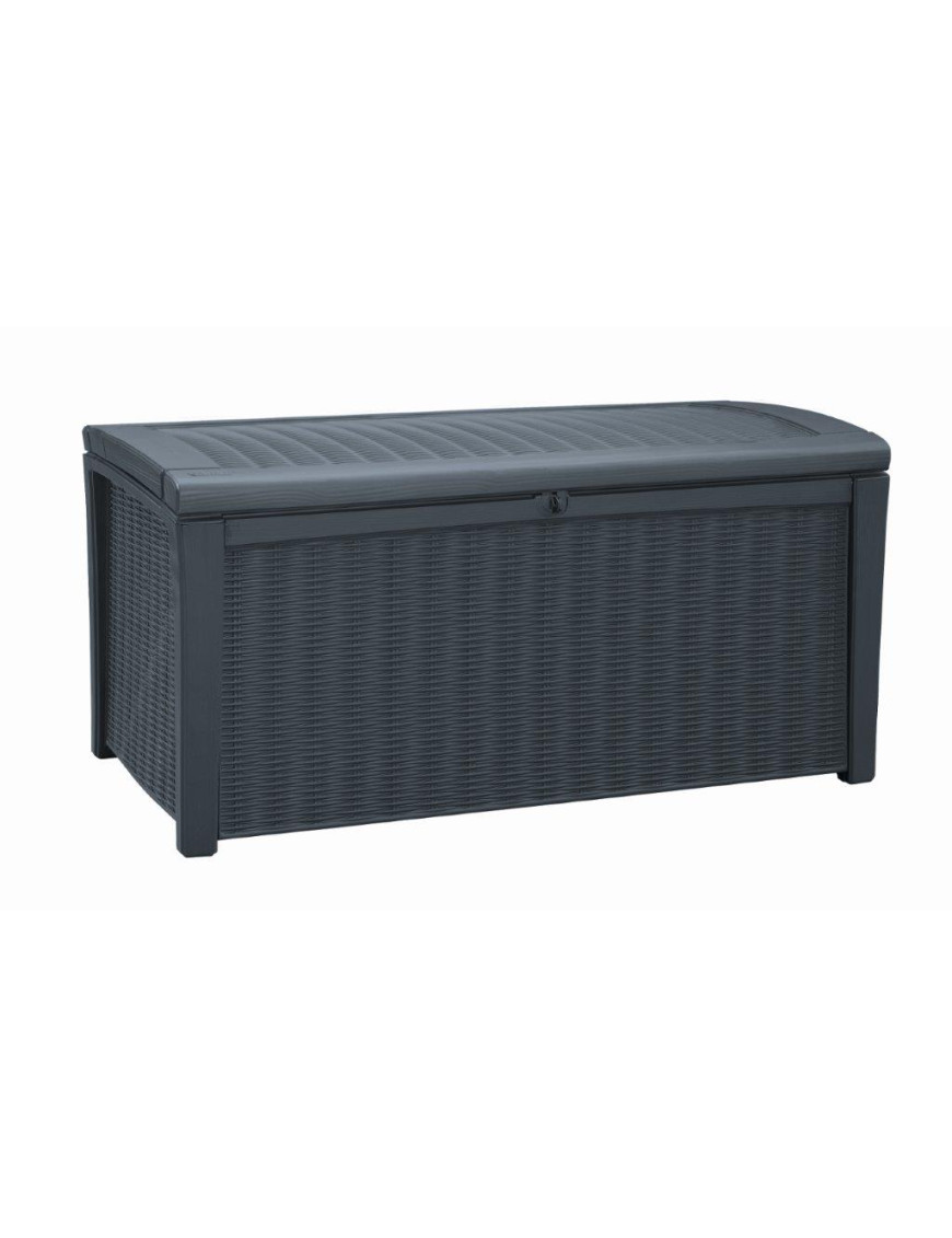Rozmerný nízkoúdržbový úložný box v dizajne ratanu, suché vetrané prostredie pre skladované veci, vodeodolnosť, nízka hmotnosť, ľahká údržba, farby na slnku neblednú, uzamykateľný, grafitová farba.