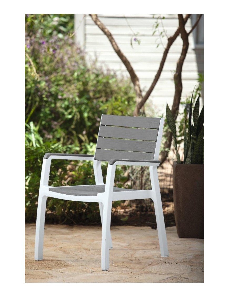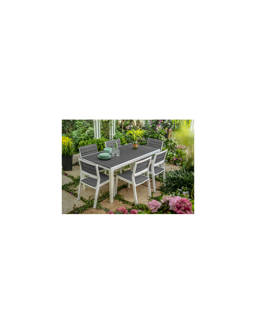 Stolička s čisto bielym rámom a šedými doskami pripomínajúcimi drevo tvoria dokonalý pár s priestranným stolom Harmony. Nekovový rám je odolný voči hrdzi a je zárukou ľahkej údržby. Farba nebledne ani po opakovanom vystavení UV žiareniu.