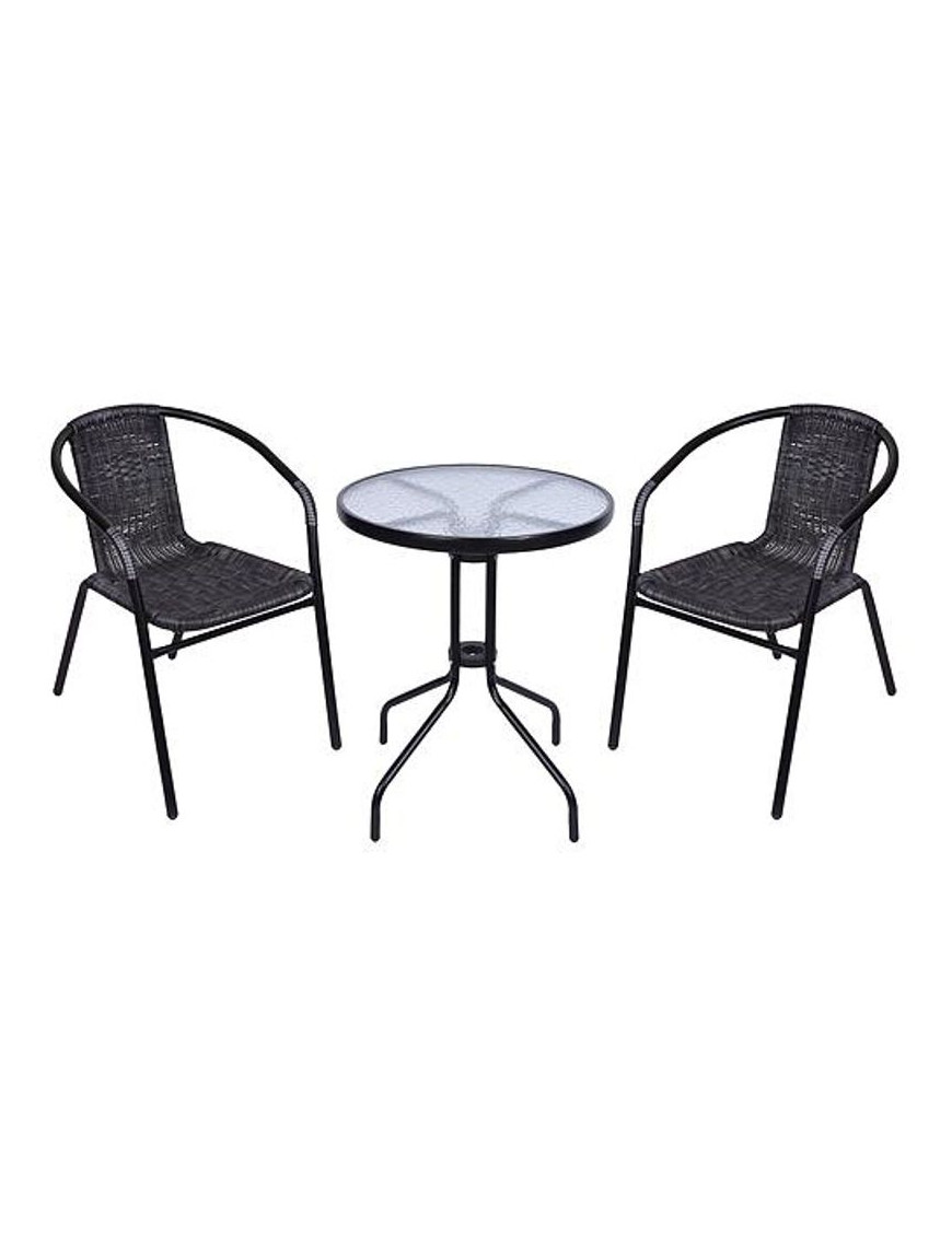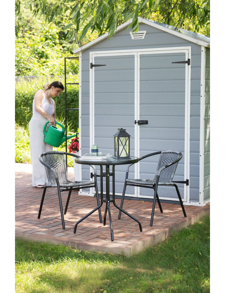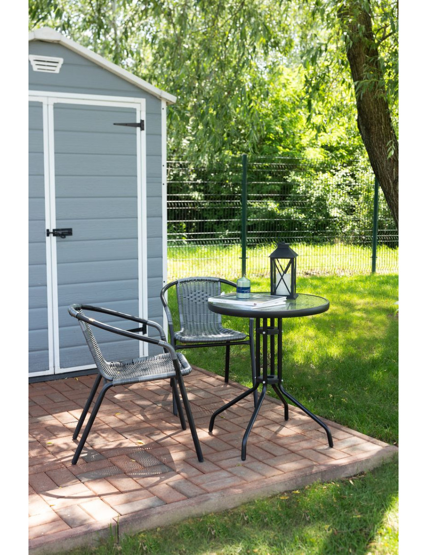 Set je skvelým doplnkom na balkóny alebo terasy, pre príjemné posedenie. Set pozostáva z dvoch stoličiek a stola. Konštrukcie stoličiek sú kvôli pevnosti a stabilite vyrobené z kovu s priemerom 25 x 1 mm. Zvyšný povrch stoličiek je pokrytý šedým, polyratanovým povrchom, ktorý pôsobí veľmi prírodne. Rozmery jednej stoličky sú 55 x 50 x 70 cm a nosnosť je 120 kg. Konštrukcia stola je taktiež vyrobená z kovu s priemerom 22 x 1 mm. Vrchná časť stola je vyrobená z tvrdeného skla, hrubého 5 mm. Celkový rozmer stola je 60 x 70 mm. Set je veľmi nenáročný na údržbu, stačí ho jednoducho pretrieť vlhkou handričkou, čím odstránite prípadnú špinu.